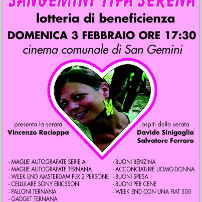 La cittadina di San Gemini si sta attivando per la propria concittadina Serena Grigioni, che a breve dovrà affrontare un lungo viaggio negli Usa per curare una rarissima malattia. Tra le tante iniziative in programma, è stata fissata per domenica 3 febbraio ore 17.30, una lotteria di solidarietà, al nobile scopo di raccogliere fondi nel contribuire all’attraversata oltreoceano della ragazza e alle spese successive. L’idea è stata concepita dagli MDS 99, gruppo di sostenitori rossoverdi in collaborazione con la locale Pro Loco e il comune e raccolta subito da alcuni calciatori della Ternana che hanno dato la loro disponibilità a partecipare. Così l’attaccante Davide Sinigaglia e il difensore Salvatore Ferraro saranno dell’evento, nella serata presentata dallo speaker del Libero Liberati Vincenzo Racioppa. Inoltre non è escluso che altri componenti del roster umbro aderiranno alla manifestazione anche in virtù del fortissimo legame che lega la Terni sportiva alle Fere. La lotteria si svolgerà all’interno del cinema comunale della località inserita tra i borghi più belli d’Italia. Il costo dei biglietti è di appena tre euro con la possibilità di poter vincere i premi messi in palio dagli organizzatori.