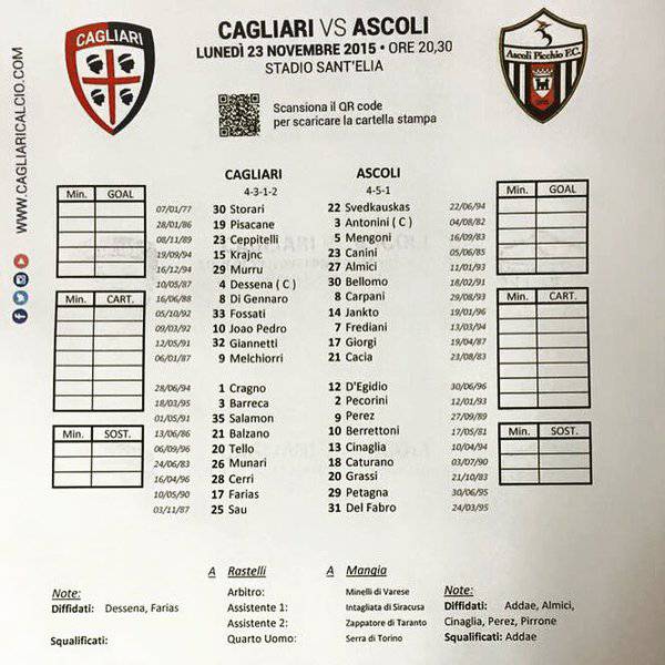 Cagliari-Ascoli, le formazioni ufficiali 23/11/2015 - 20:11 di Tommaso M Ferrante Cagliari SERIE B La distinta ufficiale di Cagliari-Ascoli ossia il Monday Night di chiusura della quattordicesima giornata di campionato: