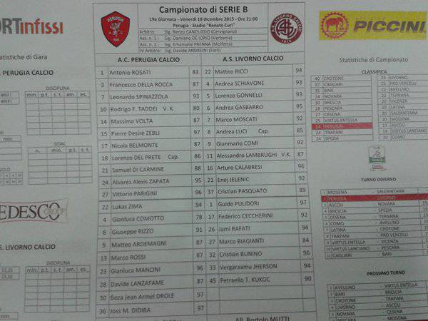 PERUGIA-LIVORNO La distinta ufficiale: