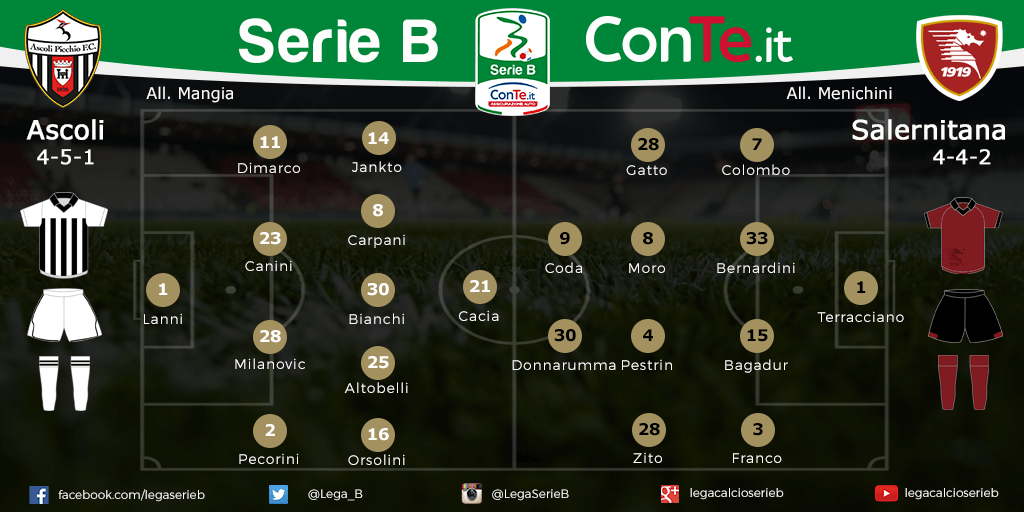 SERIE B ASCOLI-SALERNITANA Le probabili formazioni del match salvezza in programma questo pomeriggio alle 15: